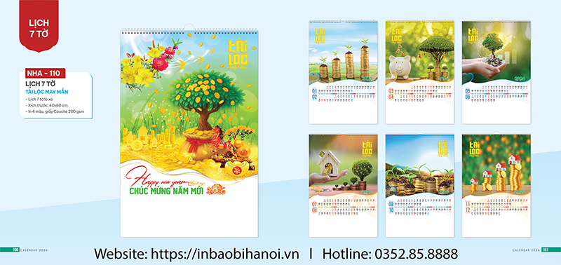 Lịch treo tường 7 tờ 2026 được in bằng công nghệ in offset 4 màu trên chất liệu giấy couche, 1 mặt, có thể in thêm thông tin doanh nghiệp theo mẫu chọn hoặc tùy chọn in thêm nội dung, hình ảnh doanh nghiệp tùy theo nhu cầu khách hàng. Lịch treo tường 7 tờ 2026 được đóng, bế lò xo hoặc nẹp thiếc đục lỗ để treo tường, bìa Lịch treo tường 7 tờ đẹp in theo chủ đề có sẵn hoặc thiết kế theo yêu cầu khách hàng. Lịch treo tường 7 tờ 2026 có túi đựng bằng nilon in trang trí hoặc túi giấy. Rất sang trọng và lịch lãm khi đem làm quà tặng cho khách hàng, nhân viên công ty hay gia đình và bạn bè